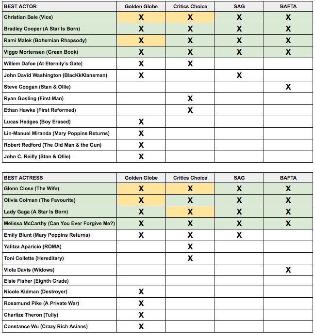 We now have the Golden Globes and the Critics’ Choice winners with PGA, DGA, SAG and BAFTA to come.