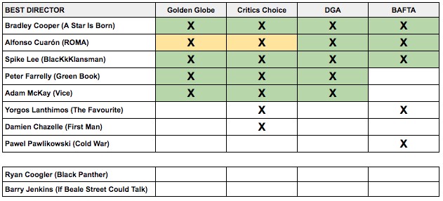 Here is where the Best Picture, Director and acting races look in terms of nominations and wins. A Star Is Born still leads in terms of nominations (with a perfect track record) but ROMA and Alfonso Cuarón are pulling out ahead with its Best Picture, Foreign Language Film and Director wins at the Critics’ Choice and Golden Globes.