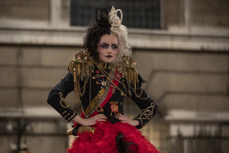 The supporting cast is exceptional as well, particularly the scene-stealing Paul Walter Hauser (I, Tonya) as Horace, who brings the comic relief, and Joel Fry (In the Earth) as Jasper, Estella/Cruella’s moral compass, who she routinely ignores. John McCrea (the upcoming Everybody’s Talking About Jamie) is also terrific as Artie, a David Bowie-esque glam-inspired friend of Estella’s who helps her discover her punk rock look. Kayvan Novak, a favorite from the hit show What We Do in the Shadows, is virtually unrecognizable as The Baroness’s lawyer—if he hadn’t have spoken, I wouldn’t have even known it was him—and oddly wasted, although he does make an appearance during a mid-credits sequence, so be sure to stick around. Gillespie’s pitch-perfect soundtrack, made up of classic rock songs that feel so perfectly integrated to the story and characters, is the foundation upon which everything else is built. The rock songs, from The Doors to the Rolling Stones to Nancy Sinatra, perfectly capture the time and place, and thoroughly enhance the audience’s immersion into Cruella’s punk rock-inspired oeuvre. The film’s overall punk vibe is what truly sets it apart from anything else Disney has ever made. There is a real sense of anarchy at play here, a world of chaos set within a very structured story, and Gillespie deserves all the credit for the stylistic vision he brings to life.