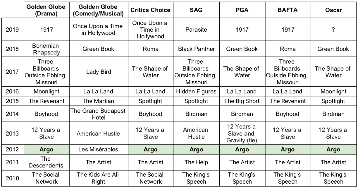 | 1. Parasite (Neon) | BAFTA, BAFTA (Foreign), CCA, GG (Foreign), PGA, SAG |