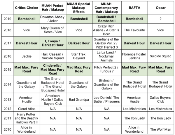 Check out the chart below for the decade of winners in the guilds and awards bodies for makeup and hair.