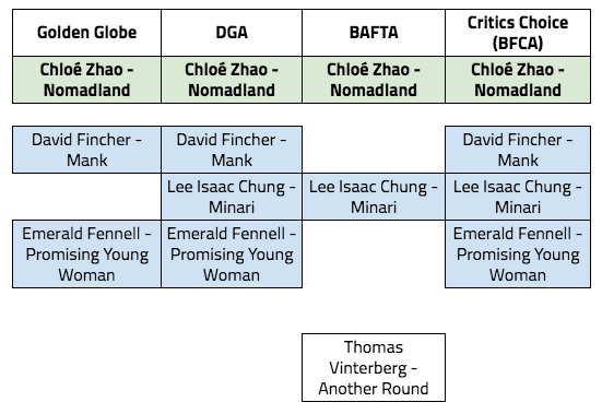 - Chloé Zhao for Nomadland (Searchlight Pictures) – GG, BAFTA, BFCA, DGA