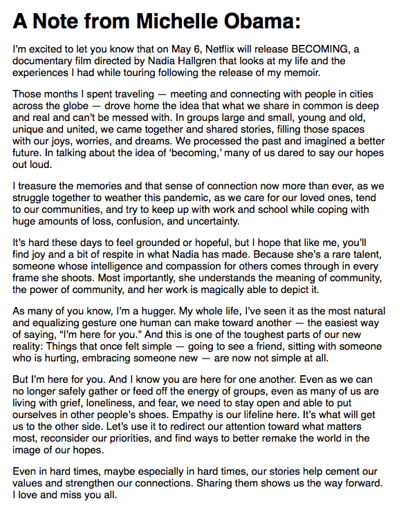 Directed by Nadia Hallgren, produced by Katy Chevigny, Marilyn Ness, & Lauren Cioffi and co-produced by Maureen A. Ryan, Becoming will debut May 6 exclusively on Netflix.