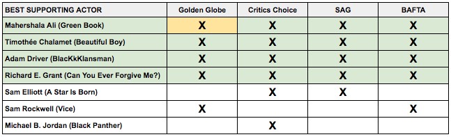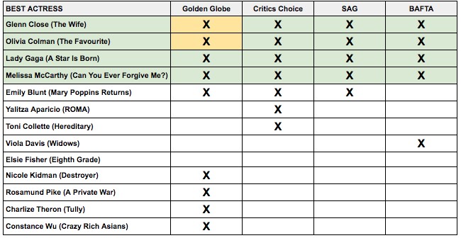 In Best Actress there is another group of four with the quartet: Glenn Close (The Wife), Olivia Colman (The Favourite), Lady Gaga (A Star Is Born) and Melissa McCarthy (Can You Ever Forgive Me?). Close and Colman won Golden Globes this last weekend. Emily Blunt (Mary Poppins Returns) is right behind, having shockingly missed out on a BAFTA nomination this week. That snub benefits Yalitza Aparicio (Roma) the most. Despite missing everything except Critics Choice (which has seven nominees), Aparicio is the face of Roma and director Alfonso Cuarón has been using every opportunity (including two at the Golden Globes) to stump for her. Like Hawke in Best Actor, Toni Collette (Hereditary) has been a critics fave but has had a difficult time translating that to industry attention.