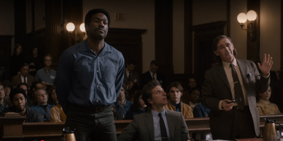 Yeah, well, that was that was my responsibility, right? I think the entire exploration of figuring out Bobby Seale, and portraying Bobby Seale in this particular situation was an exploration in restraint. He deserved so much more, he deserved better treatment, but he also deserved to make more of a scene than he actually did. He was on trial and he should not have even been there. As he puts it, he believes that he was thrown in to make the group look a certain way. But then the most blatant thing was that he was on trial without representation. And that was so obvious and so blatant. He had every right to stand up and say, “Hey, I don’t belong here. And if you’re going to have me here, I need a lawyer. My lawyer is not present. Everyone knows it.” And he should have been making a lot more noise. But he knew that he couldn’t, he could never get away with coming in and pulling some of the antics that his co-defendants came with and so he had to restrain himself and to negotiate how and when to voice his displeasure. And that was fun for me. Sometimes it was fun to let my body go completely slack because he just couldn’t do it today. Other times, I sat up and I said, “Okay, well, you know what— I don’t have a lawyer, so I’m going to play the lawyer.” So I’m extremely attentive, I’m even taking notes, you know, and he would stand up and try to put on the mannerisms of a lawyer. And other times he’d be completely dejected and disengaged. And so it was a very fun, exciting exploration of figuring out how I will get what I want. And restraint was one of the biggest parts of that.