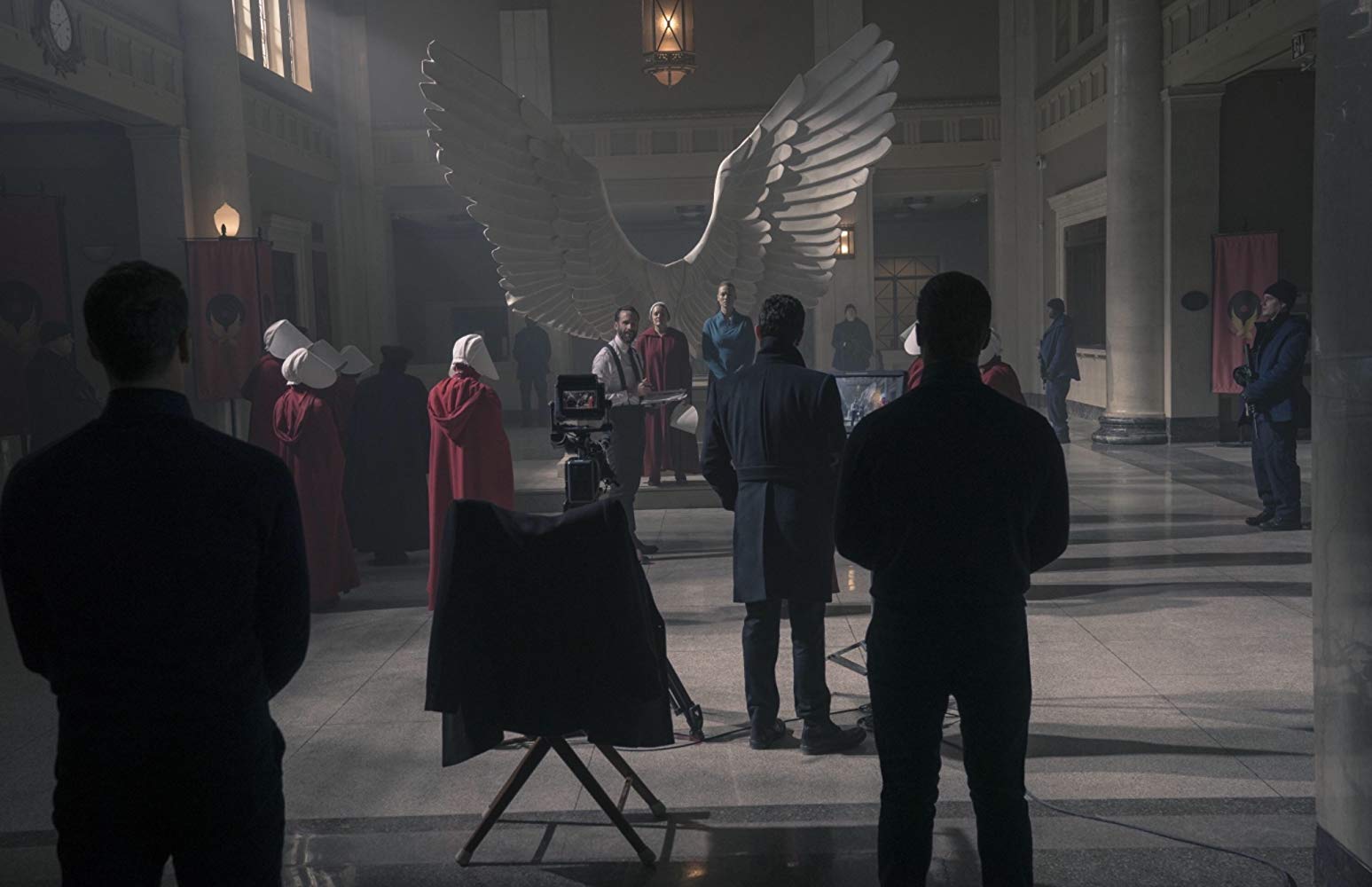 The next day finds everyone at Fred’s carefully calibrated photo op, and our first view of June is with a statue of Gilead’s symbolic wings behind her, rising up, making June look like some kind of avenging angel. Fred wants to get everything and everyone just right for this, including, apparently, inviting Nick for some emotional manipulation of June. Fred pretends that he’s surprised to see him, but it’s clear he’s going to use Nick to soften June. June is thrilled to see Nick, but she still is disgusted as she’s forced to participate in this video that is intended to put more pressure on Canada to return Nichole.