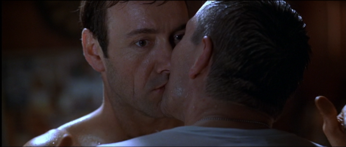 Back in the burbs, Lester if feeling fit as a fiddle. Jealous that his wife and daughter are getting so much action while he’s only had his hand as company, our horny hero is ready. Luckily, Carolyn’s nowhere to be found at the moment and Jane just happened to invite the angelic Angela over for the night. And even better for Les, it’s her day off from filming American Pie, so she doesn’t have teenage studs on the brain. As he goes into the garage to do some last minute lifting, he’s surprised to be met with the creepy Colonel waiting outside, ready to confront him. After a little odd chit chat, the Colonel gives Lester a big smooch on the lips. Flattered and maybe even a little curious, Lester tells the feisty Fitts that he got the wrong idea and the two go their separate ways. Meanwhile, Jane and Angela have been bickering with each other in her bedroom which is interrupted by Ricky running into the room. It turns out prior to his daddy’s desires in the garage, the two got into a huge argument and Ricky decided to leave the house and never come back. He asks Jane if she’ll run away to him to New York, to which she quickly agrees. Angela tries to say how much of an awful idea that is, but the two future runaways tell the bitch to shut up and she storms off. The young high school student heads downstairs where Kevin Spacey awaits, what could possibly go wrong?